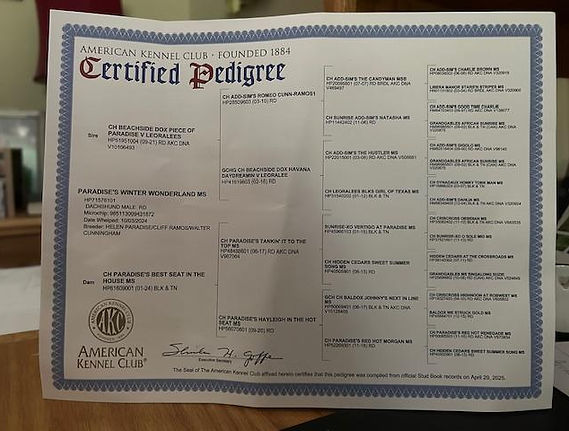 Please click on the photos below to see some past Paradise Dachshund puppies enjoying their life as therapy dogs, out at sea, out hiking, bringing comfort to the elderly, training as a show dog, and family pet buddy